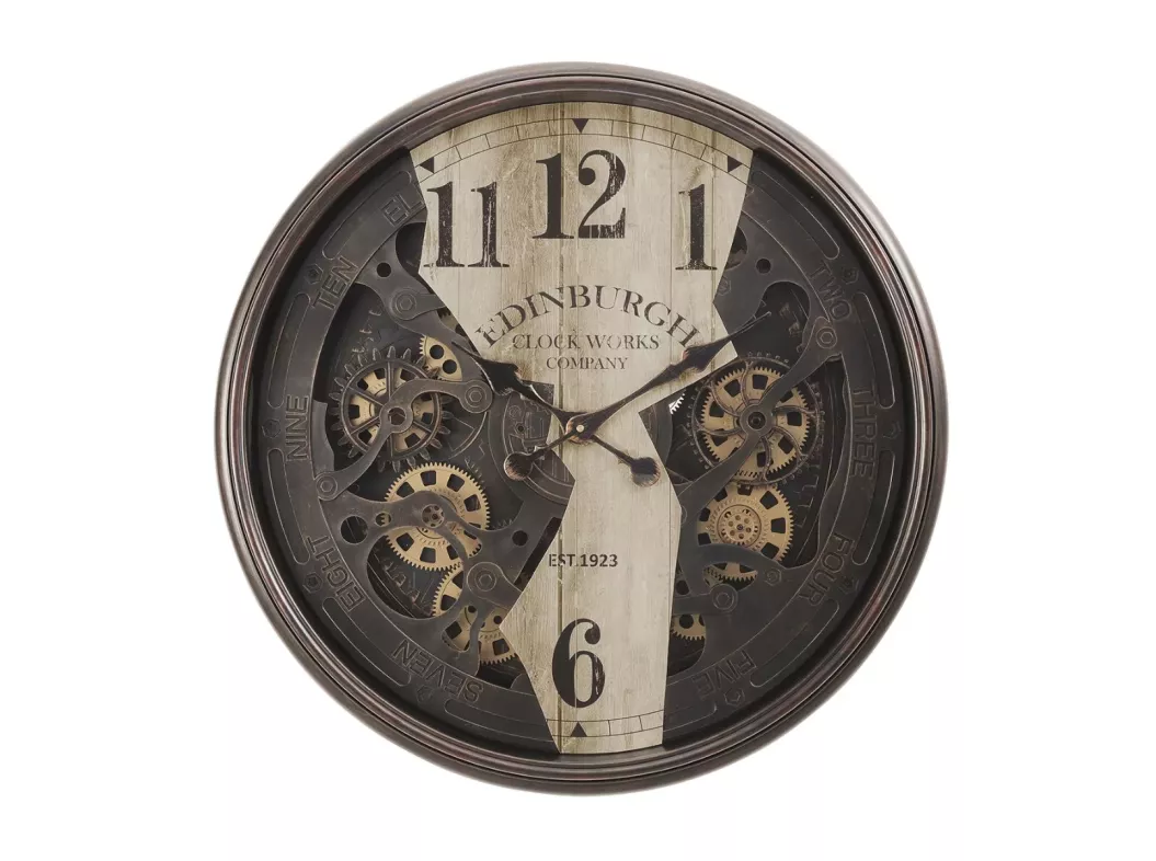 Add some industrial chic to your home with this stunning 30" round wall clock with a moving gear mechanism, perfect for making a statement in a transitional space from the living room to the office. This large, oversized clock features a durable plastic frame in a warm dark brown finish and a clear glass surface for a sleek finish. The functioning metal gears add a unique touch to the deconstructed vintage design, while the easy to read analog display can be spotted at a distance. With a quartz movement for accurate timekeeping and a non-ticking operation, this clock is both functional and decorative. No is assembly required, just drop in 3 AA batteries (not included), hang it up and enjoy a hassle-free addition to your home decor. For indoor use only, this quality made vintage wall clock is backed by a 2 year limited warranty against manufacturer defects for your satisfaction.