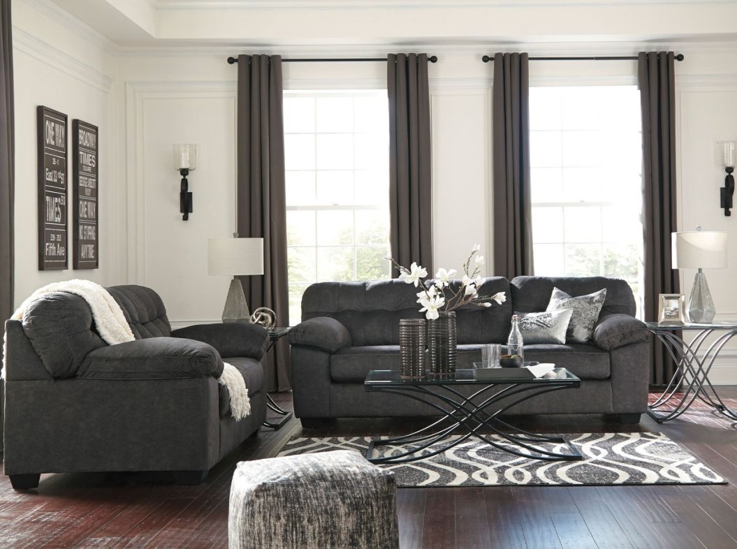 The Accrington Granite Sofa and Loveseat Set from Ashley Furniture is the perfect blend of decadent comfort and contemporary flair. With Tufted box cushioning and thick pillow top armrests brilliantly merge style and a sumptuous feel. Wonderful to the touch, the Accrington Sofa and Loveseat features a granite gray fabric for that trendy chic look.