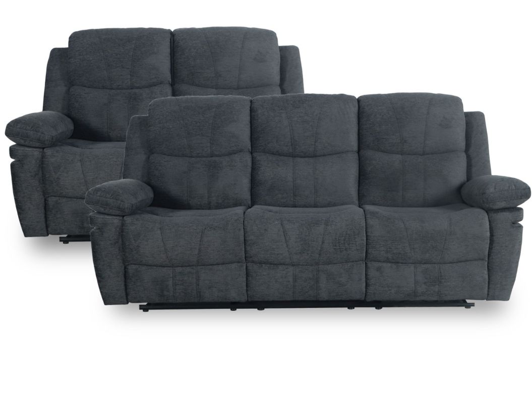This reclining sofa set is draped in Mayodan Lead fabric with contrast stitching. Wide seat cushions, high back rests and rounded arm rests ensure you will relax in comfort.