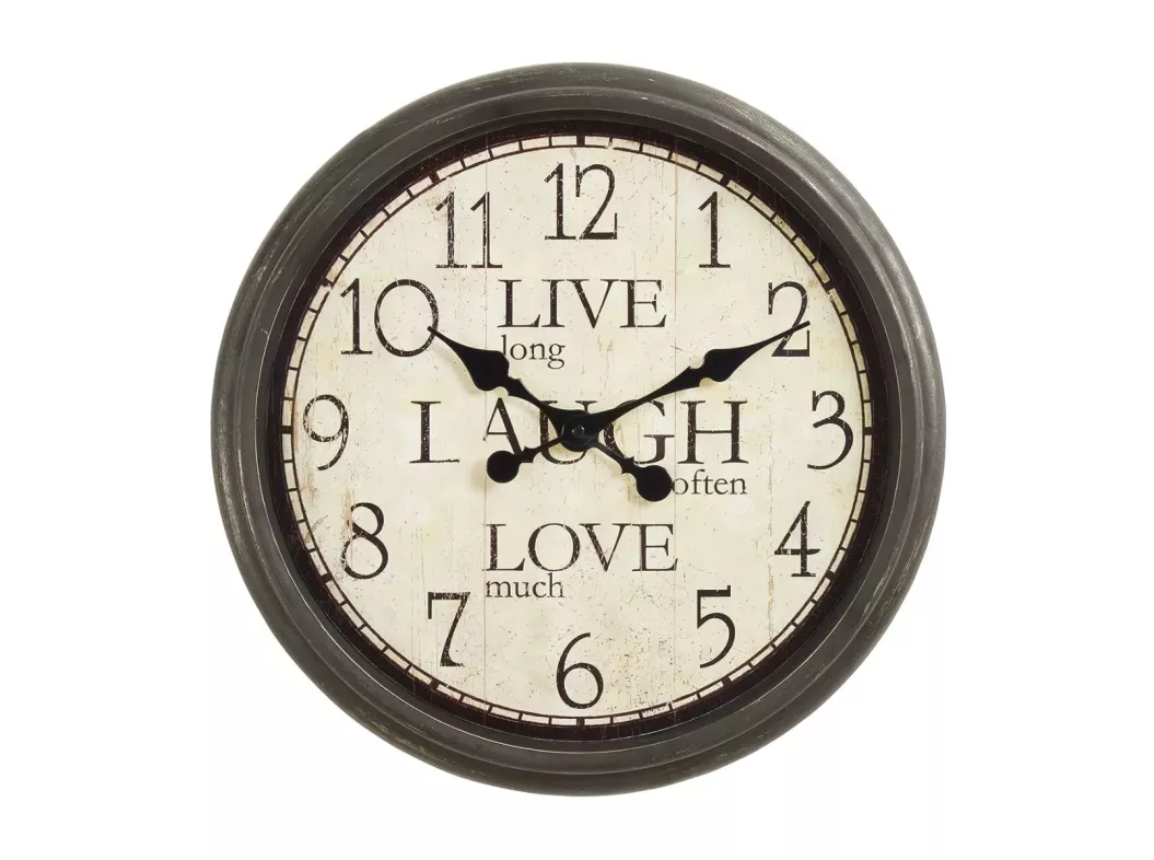 Stay ahead of the trend with this simple yet charming 16" round wall clock in antique brown. This clock effortlessly combines functionality with style, making it the perfect addition to your home decor. The easy to read printed numerical and eye-catching image display, with black metal hands is protected under a clear glass surface and a durable plastic frame, creating a timeless look that will enhance any room. With quartz movement for accurate timekeeping, this analog clock requires just 1 AA battery (battery not included) and comes with a 2 year limited warranty for peace of mind. The non-ticking design ensures a quiet atmosphere, making it ideal for indoor use only. Plus, with no assembly required, you can instantly elevate your space with this transitional style decorative clock.