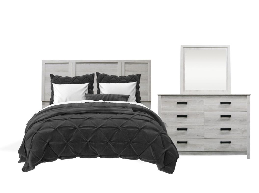 The Aurora bedroom collection from Dynamic Furniture has rustic character paired with industrial features in an antiqued whitewashed finish that lends a feeling of strength and simplicity. The Aurora bedroom set offers ample storage and sturdy construction, roller bearing side guides, and finished drawer interiors to protect even your most important items.