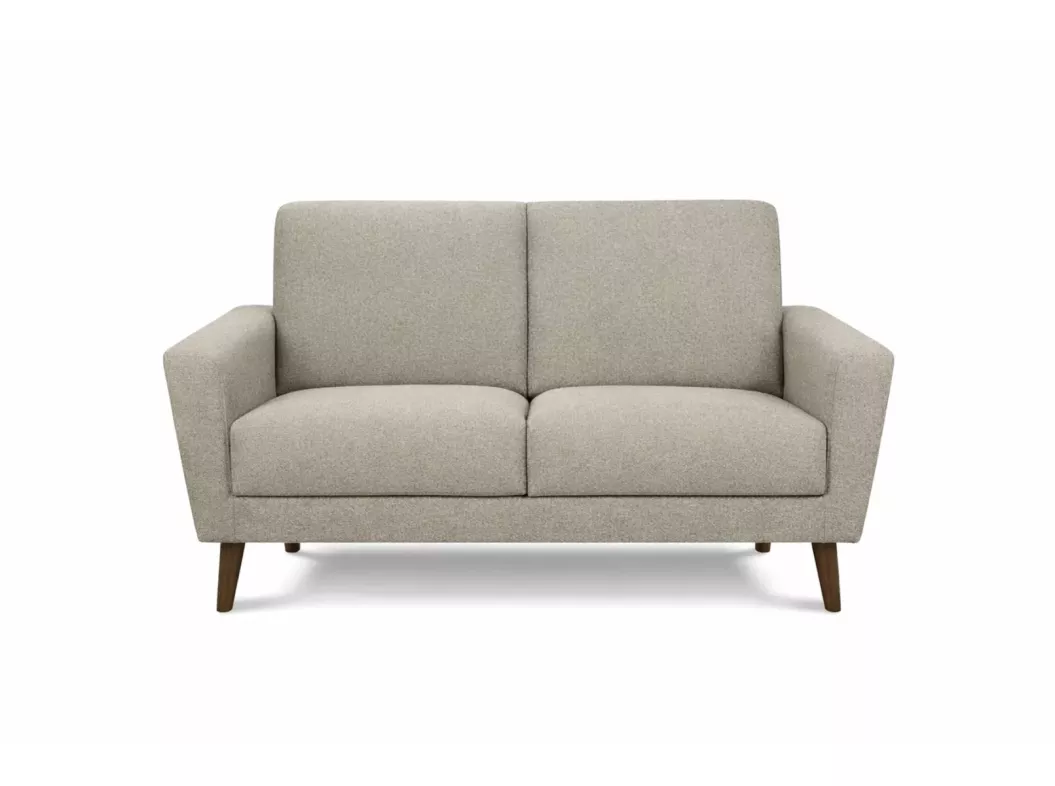 This 58" long mid century inspired love seat showcases a chic light brown fabric finish, sleek upholstered lines, and warm walnut wood legs—making it a striking addition to modern living rooms and stylish spaces.