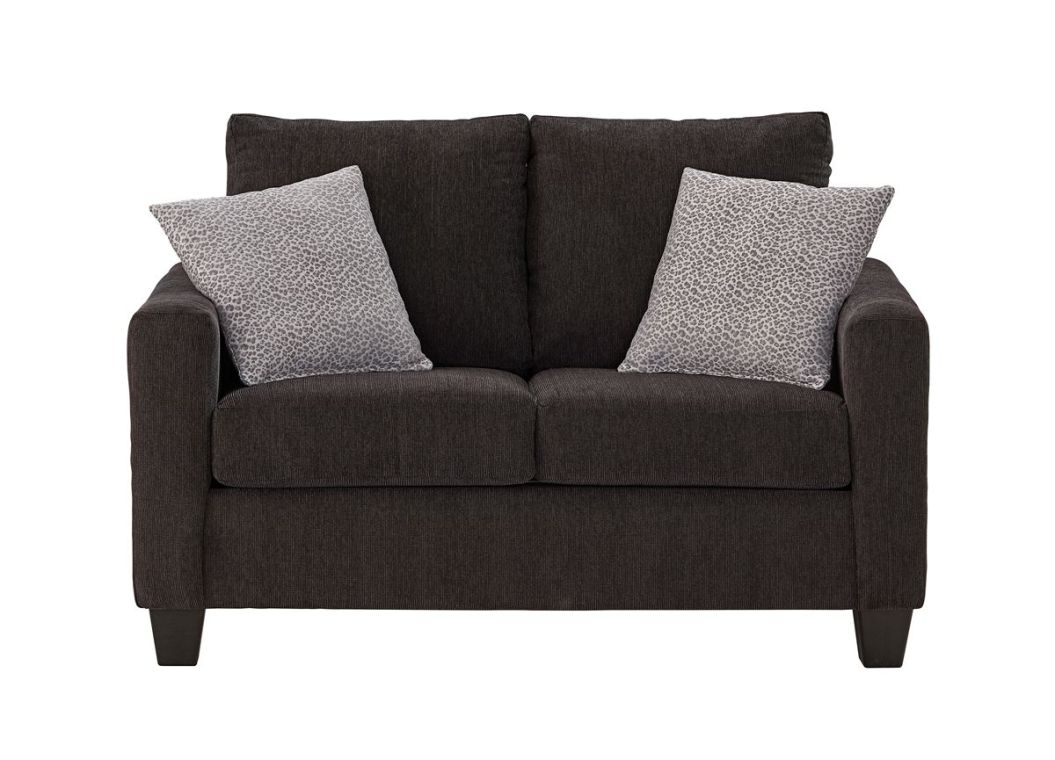 Featuring sleek track arms, plush seat cushions, semi-attached back cushions, neutral accent pillows, all wrapped in a soft woven chenille micro-fibre, this Believer Onyx Loveseat is both stylish and welcoming.