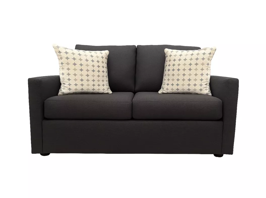 This contemporary loveseat offers clean lines and inviting comfort, making it a perfect fit for modern living spaces. Upholstered in a rich, dark fabric, it features plush seat and back cushions that provide supportive comfort without sacrificing style. Track arms and tapered legs add a sleek, tailored look, while the compact size makes it ideal for apartments, condos, or smaller rooms.