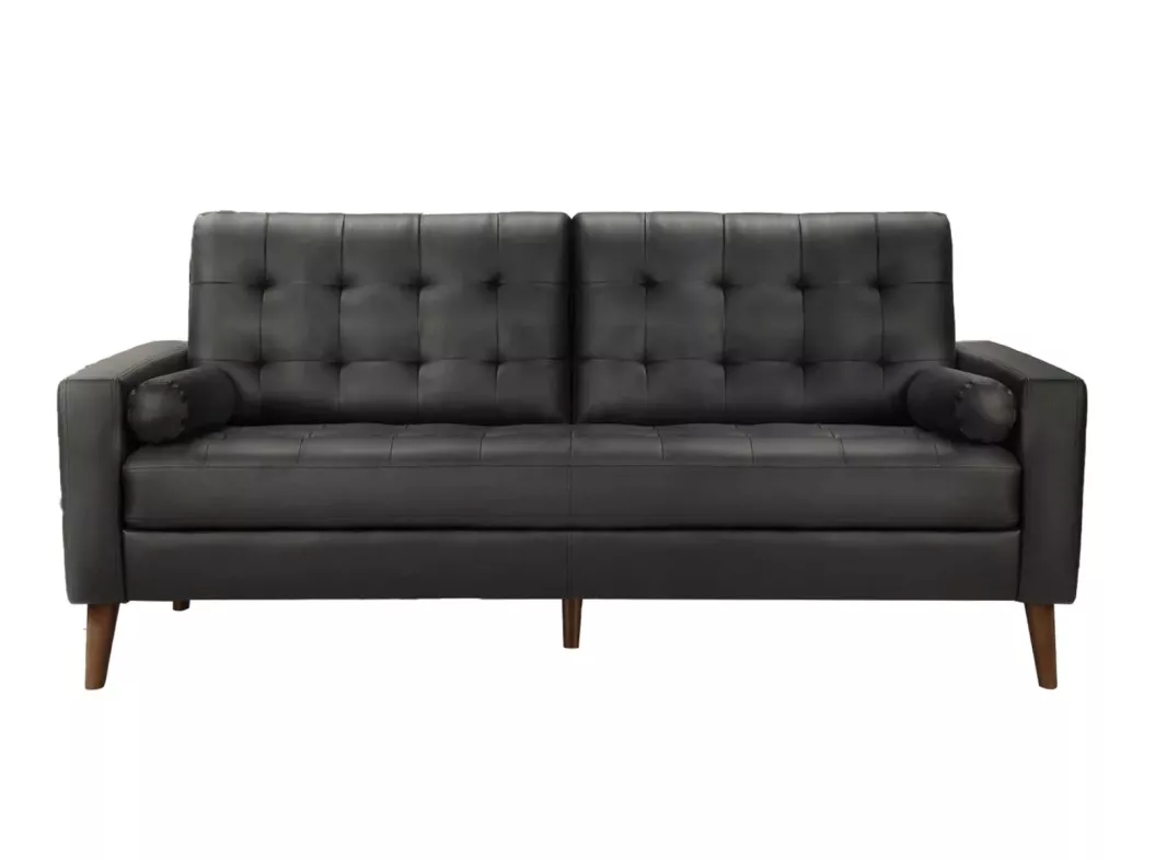 Elevate your space with this sleek 75" long mid century style sofa, upholstered in stylish and comfortable black leather-look. Compact yet roomy, this 3 seater sofa features buttonless tufting, no-sag pocket coil springs and removable Dacron-filled back cushions for lasting comfort. Built on a durable solid wood frame with tapered solid wood legs in a warm brown finish. Includes padded square armrests and two matching cylinder bolster pillows for a stylish, finished look. Easy assembly with illustrated instructions included and a 1 year limited warranty against manufacturer defects for your satisfaction.