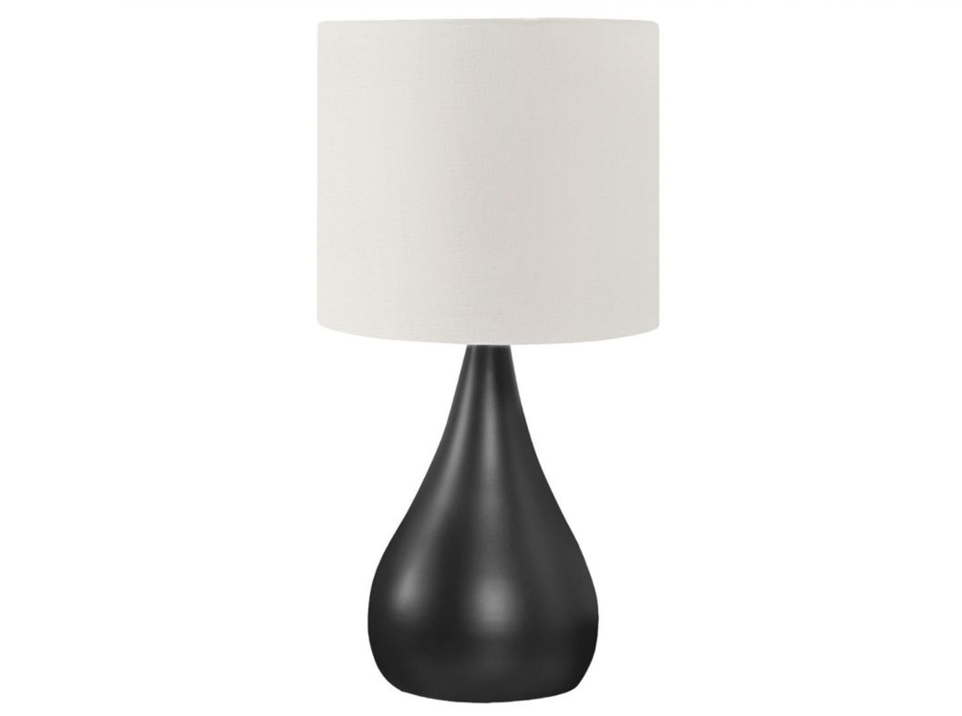 This striking accent lamp, created with a smooth, black metal teardrop base and topped with a classic, ivory linen tapered drum shade, is the perfect addition to your bedroom, living room, office, or anywhere else you need to brighten up a room. With the convenient rocker switch attached to the 6ft black cord, this lamp accommodates a 60W/120V bulb (not included) to brighten up and elevate a nightstand or bedside table, console, end, or side table for a perfect combination of chic style and effortless functionality. Made with quality materials, this decorative lamp includes a 2-year limited warranty against any manufacturer's defects for a worry-free purchase.