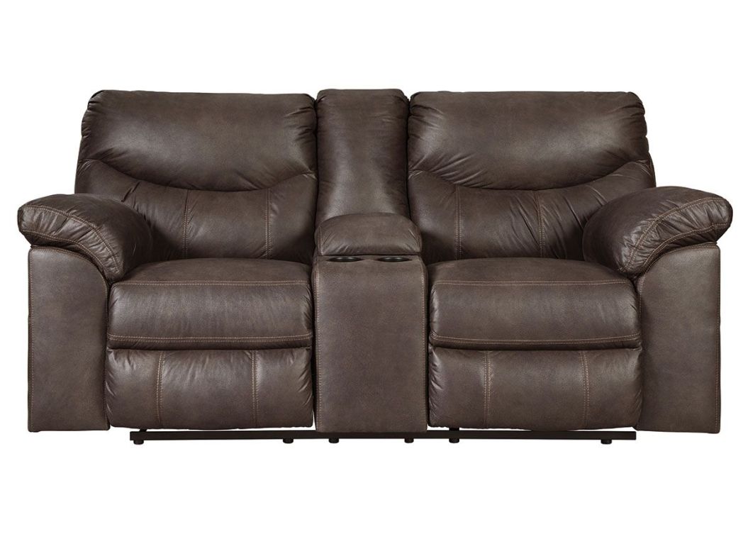 The Boxberg Teak Motion Loveseat features double stuffed armrests and sumptuous cushions cradle and support in all the right places. Dual-sided recliner with pull tab reclining motion. Cup holders and hidden storage complete the experience. While it might look like you broke the bank, a sumptuously soft fabric keeps indulgence well within budget.