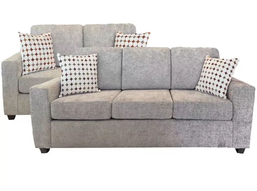 Bring effortless comfort and modern style to your home with the Brady Military Sofa and Loveseat Set. Wrapped in a soft, durable textured fabric, each piece features plush seating, supportive cushions, and gently rounded arms for a relaxed, inviting feel. Coordinating accent pillows add a touch of pattern, making this set the perfect blend of comfort, versatility, and contemporary design for any living space.
