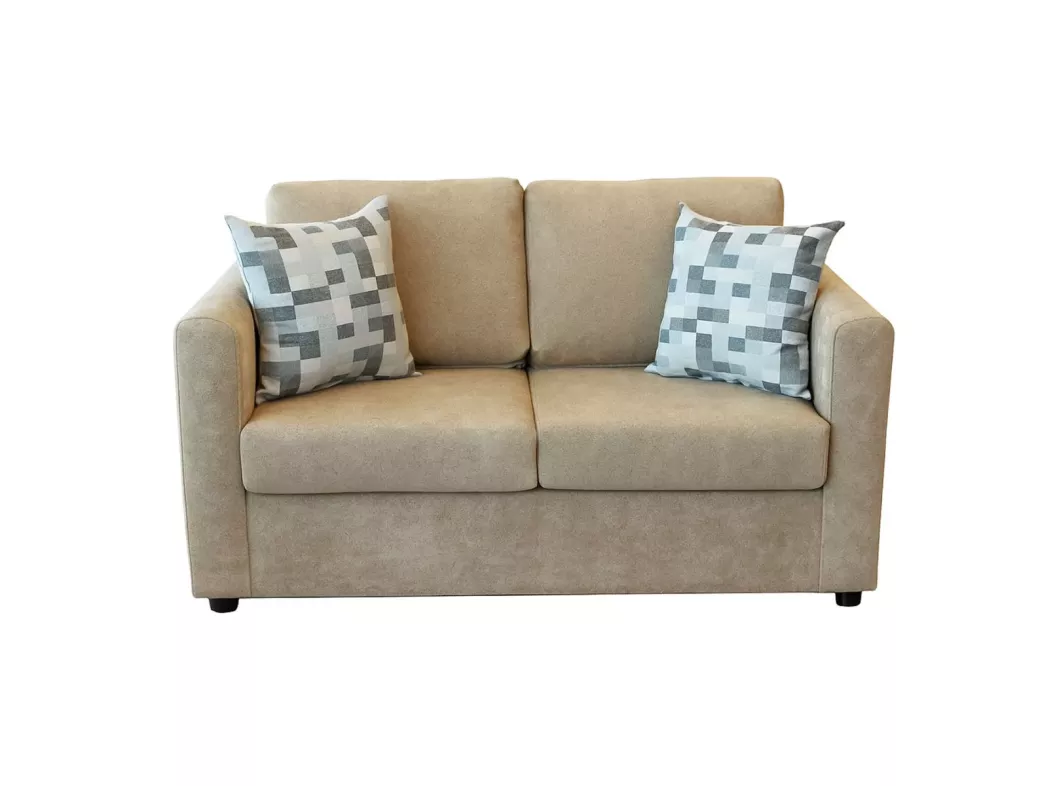 Compact yet cozy, this 2-seater loveseat complements the sofa beautifully with matching upholstery and design. The clean lines and neutral camel tone make it a versatile choice for small spaces or as an accent piece in a larger living room. It includes two coordinating geometric-patterned pillows that enhance its modern aesthetic. Perfect for creating an intimate seating area or pairing with the sofa for a cohesive set.