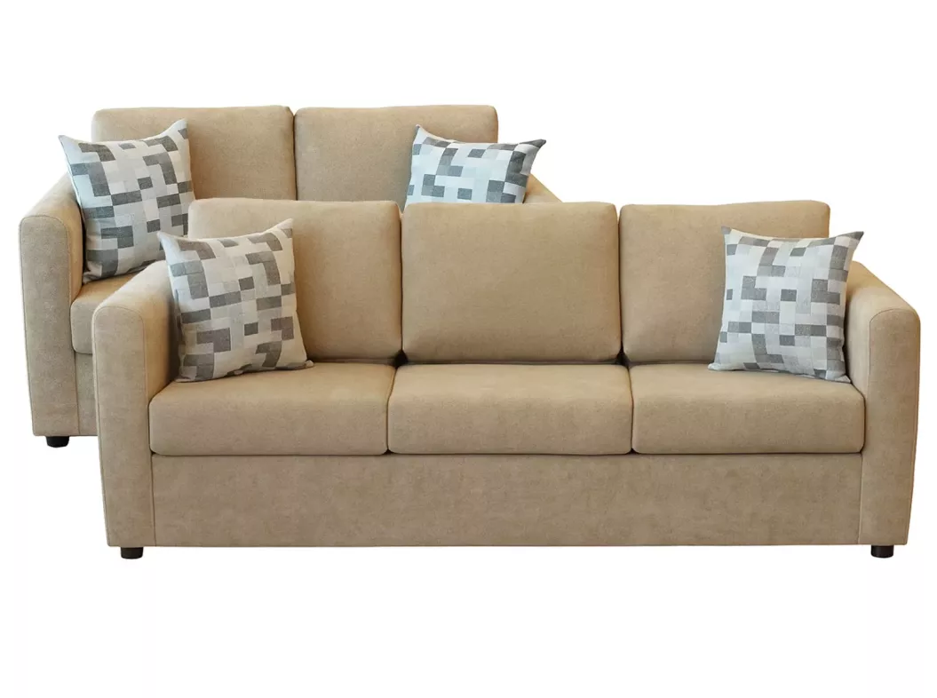 The living room set combines modern comfort and timeless design with a coordinated sofa and loveseat duo in a warm camel fabric. Each piece features structured cushions, sleek arms, and stylish gray patterned throw pillows that add texture and visual interest. Paired with a wooden coffee table and neutral décor, the set creates a serene and welcoming atmosphere suitable for any home. This collection is perfect for anyone seeking a harmonious, elegant, and functional living space.