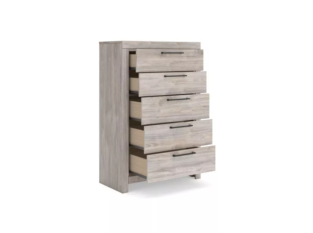 This bright and airy chest of drawers evokes the tranquil vibe you long for in your dream destination. Its light gray finish over replicated oak grain whispers “inviting" and "relaxed.” Five roomy drawers with contemporary handles offer easy access to hidden storage for cozy sweaters, casual tees and so much more. Laid-back, practical and versatile, it's a piece you’ll love coming home to.