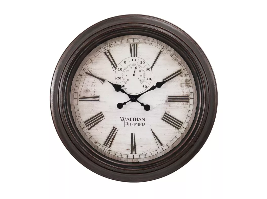 Add a touch of sophistication to your living space with this stylish 20" round wall clock in a dark brown hue with subtle vintage detailing. This decorative accent piece is encased with a thick, molded plastic frame and metal hands with an antique look under a clear glass surface. This analog clock is powered by 1 AA battery (not included) and boasts quartz movement for accurate timekeeping. The large roman numeric design makes it easy to read, while the non-ticking mechanism ensures a quiet environment. With no assembly required and a 2 year limited warranty, this clock is the perfect addition to any home decor. Suitable for indoor use only, this transitional clock is a must-have for trendsetters looking for timeless style with modern functionality.