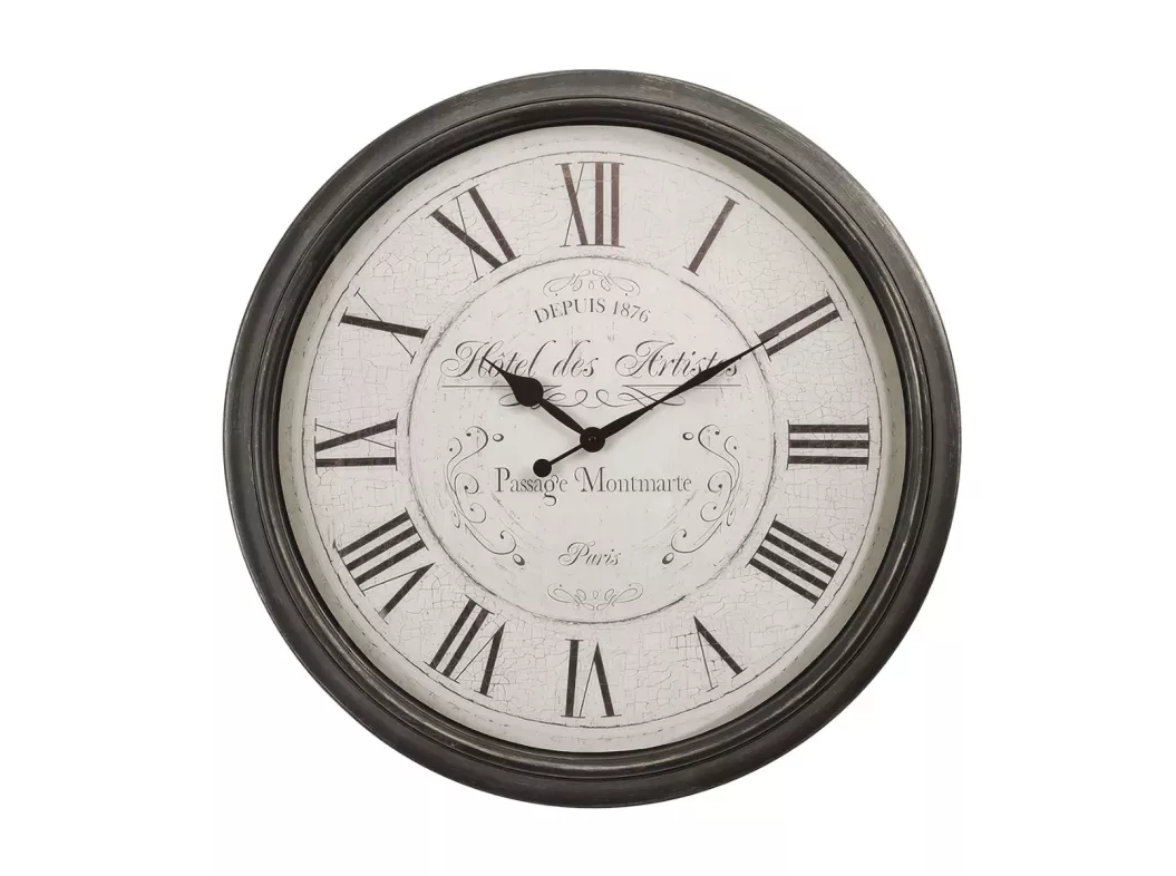 Trendy and stylish 30" round wall clock with a durable plastic frame in an elegant brown hue and subtle distressing for a classic appeal in any home decor.