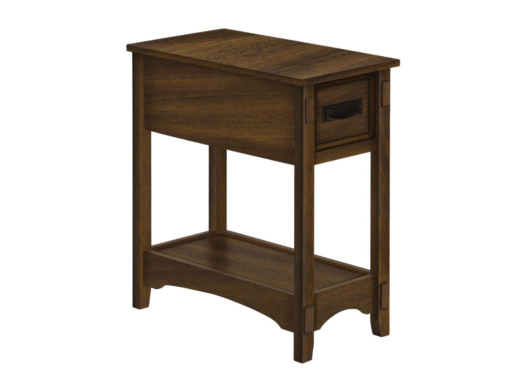Are you looking to add a touch of style and sophistication to your bedroom or living room? Look no further than this 24-inch-high walnut veneer accent table! This fashionable and practical side table is durably designed to last for years. This accent table is easy to assemble with full illustrated instructions and all parts included, along with a 5 year limited warranty against manufacturer's defects. The easy to clean top makes it perfect for placing items such as a lamp, books, magazines along with a bottom shelf for added storage. The space saving design includes a storage drawer with a classic black metal pull handle to tuck away small essentials. The walnut brown veneer finish makes this end table design look timeless and transitional - perfect for any type of home decor. Whether you are looking for a narrow nightstand to add to your bedroom or as a side table next to a chair or sofa in your living room, this versatile accent table is the perfect solution!
