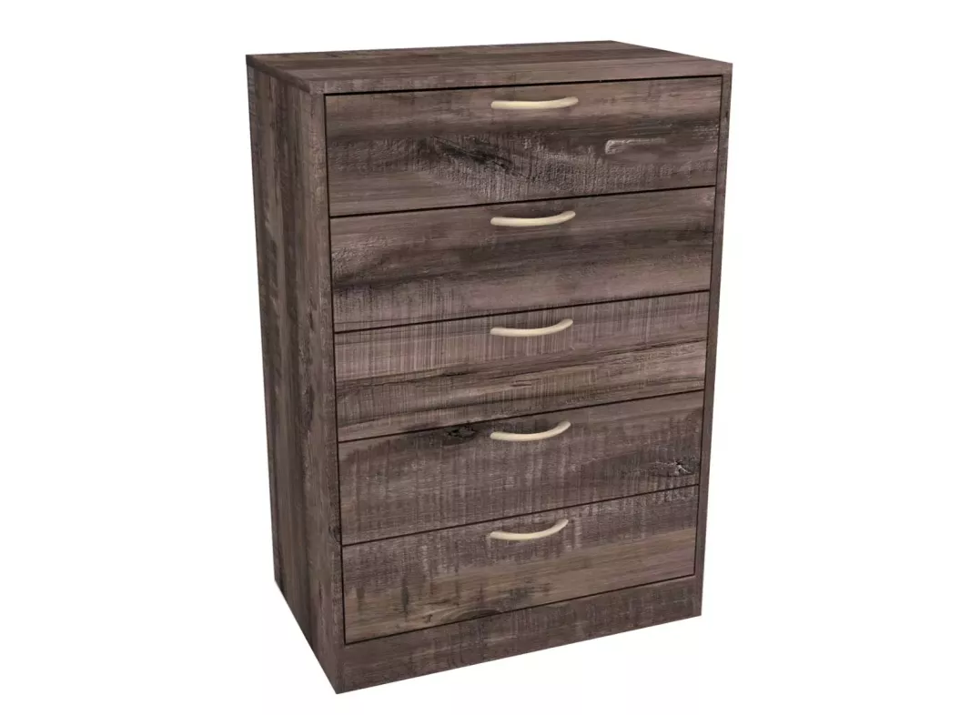 The Canyon Maple 5-Drawer Chest from Dynamic Furniture features a deep maple finish. This carefully-crafted chest features clean lines throughout, light distressing, as well as brushed metal knobs to compliment this warm and cozy look. Spacious drawers in the case pieces allow for ample storage space.