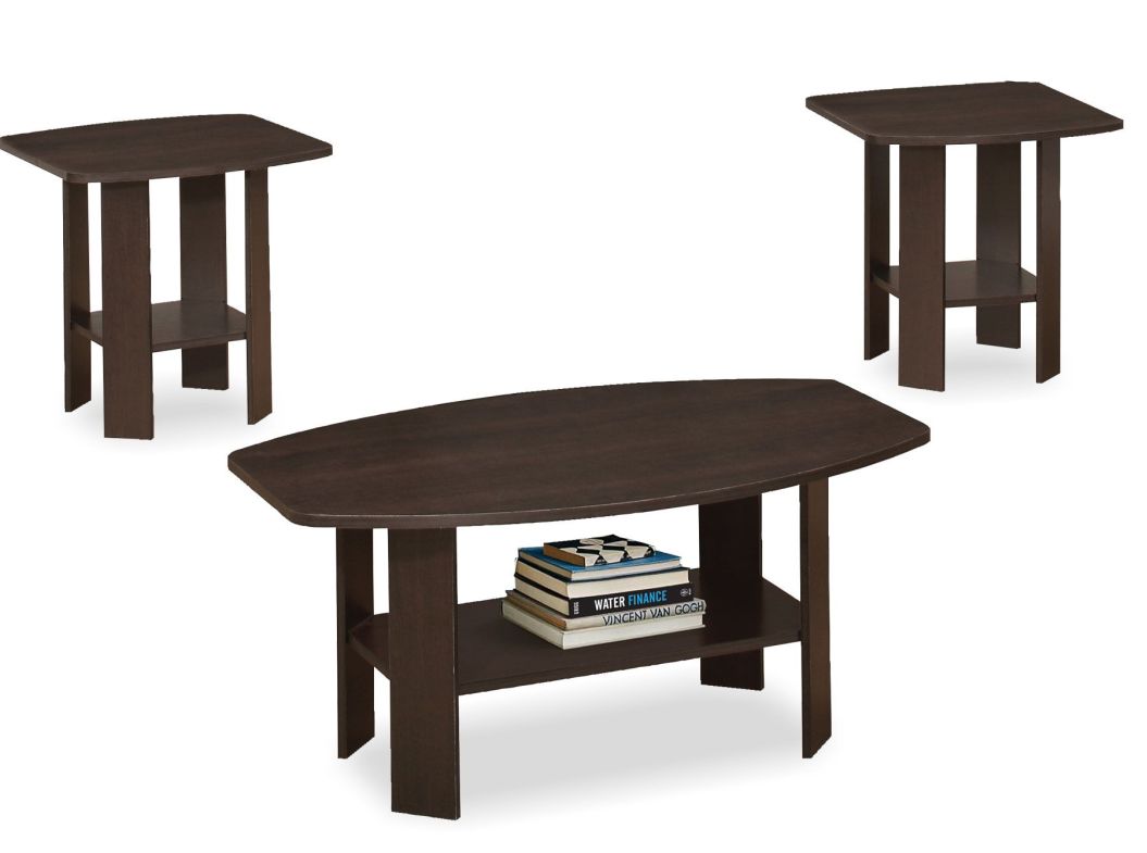 Refreshing your living room is a breeze with this convenient 3-piece table set. Featuring a coffee table and two matching end tables finished in a rich cappuccino, this set will easily coordinate with a variety of decors. The modern angles paired with minimalist design give this set a contemporary look perfect for any casual modern space.All tables feature a lower storage shelves ideal keeping for magazines, books, or accent pieces.