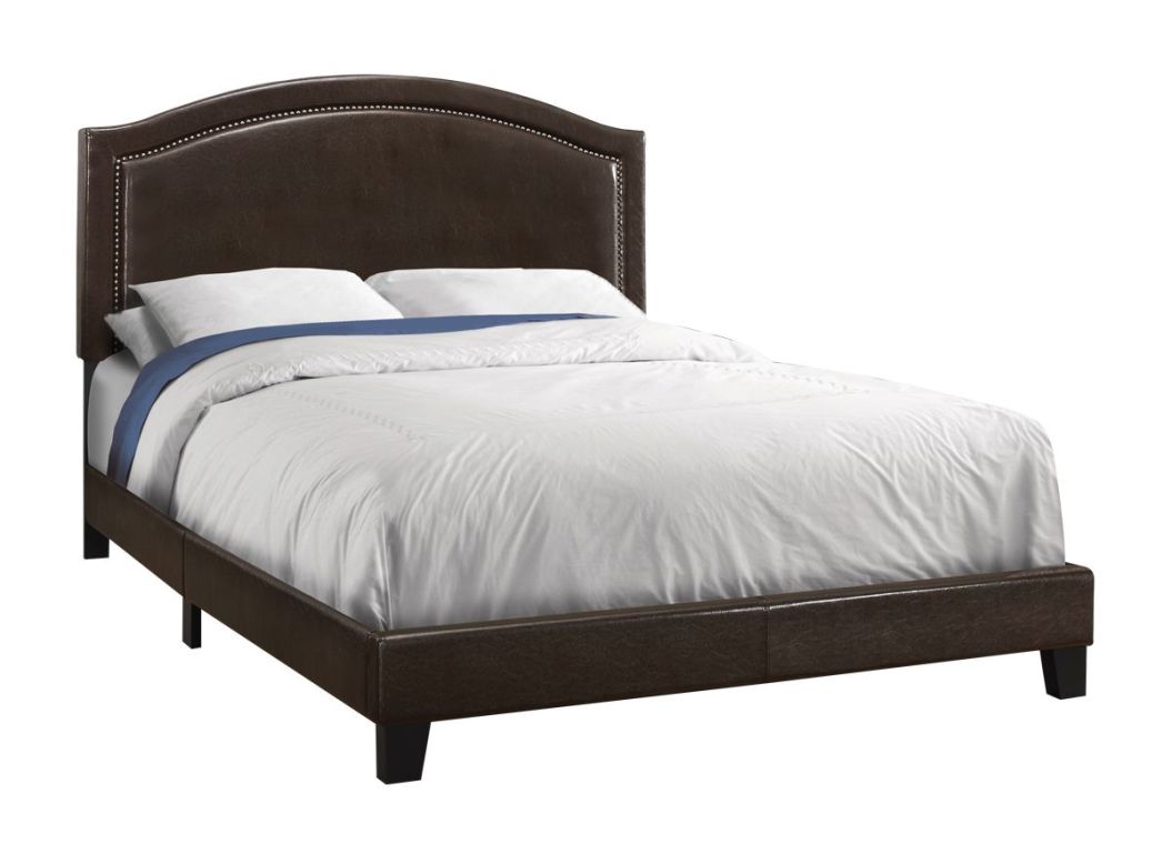 The Brown Nailhead Complete Queen Bed from Monarch has a contemporary style with subtle accents that will fit a variety of décor. With a sleek upholstered Brown leather-look headboard and footboard, with accent nailhead trim, this carefully crafted bedroom is sure to compliment any decor. This Brown Nailhead Complete Queen Bed includes the headboard, footboard and rails.