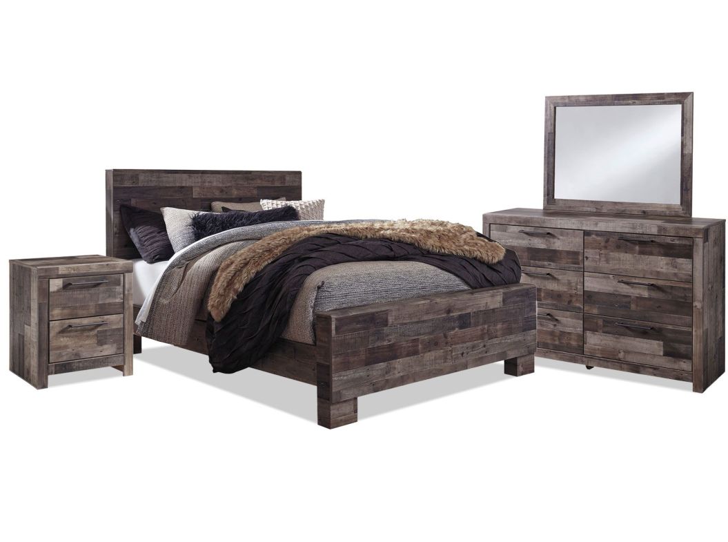 The Derekson 6-Piece Queen Bedroom Set from Ashley Furniture has a rustic butcher block finish over replicated pine grain with an authentic touch that will fit a variety of décor. With a prominent rustic wood grain finish, combined with an antique gunmetal finish drawer knobs this carefully crafted bedroom dresser is sure to compliment any bedroom decor. This Queen bed includes a headboard, footboard, rails, dresser, mirror and nightstand. The matching chest is sold separately. Also available in a storage bed.