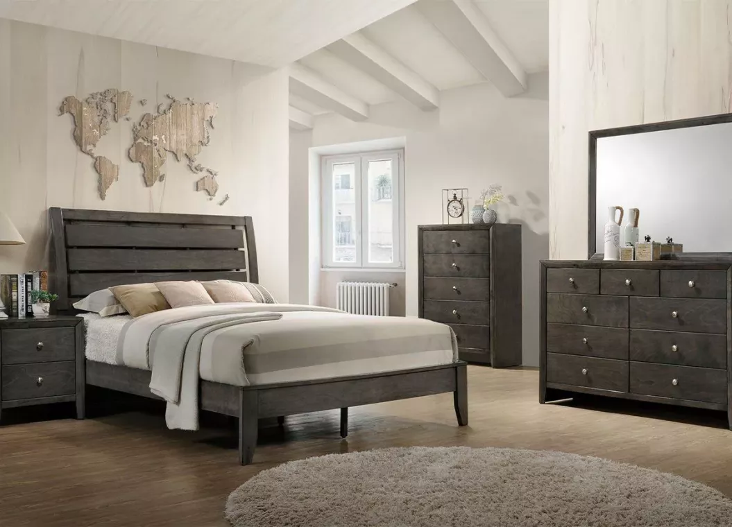 Evan Grey Queen Bedroom Set. Includes the dresser, mirror, queen headboard, footboard, rails and nightstand.
