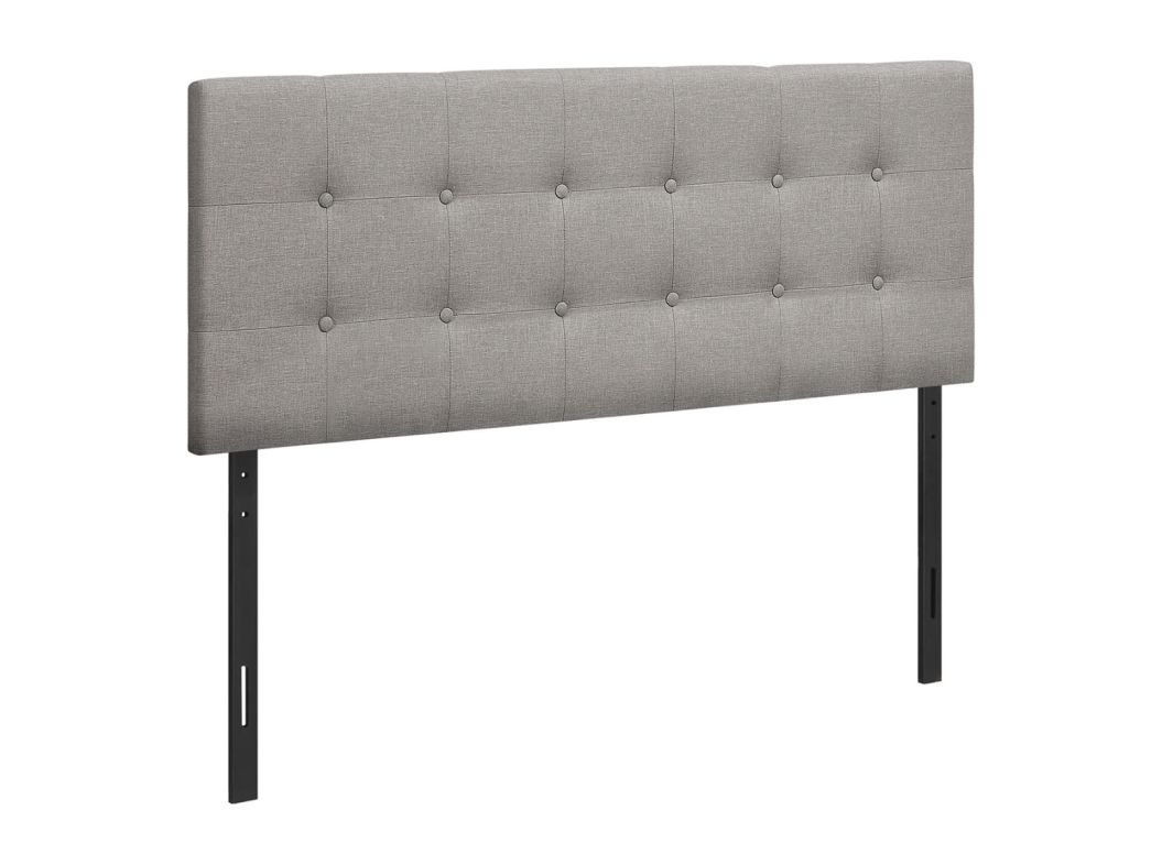 - Button-tufted upholstered headboard in a grey linen-look fabric
