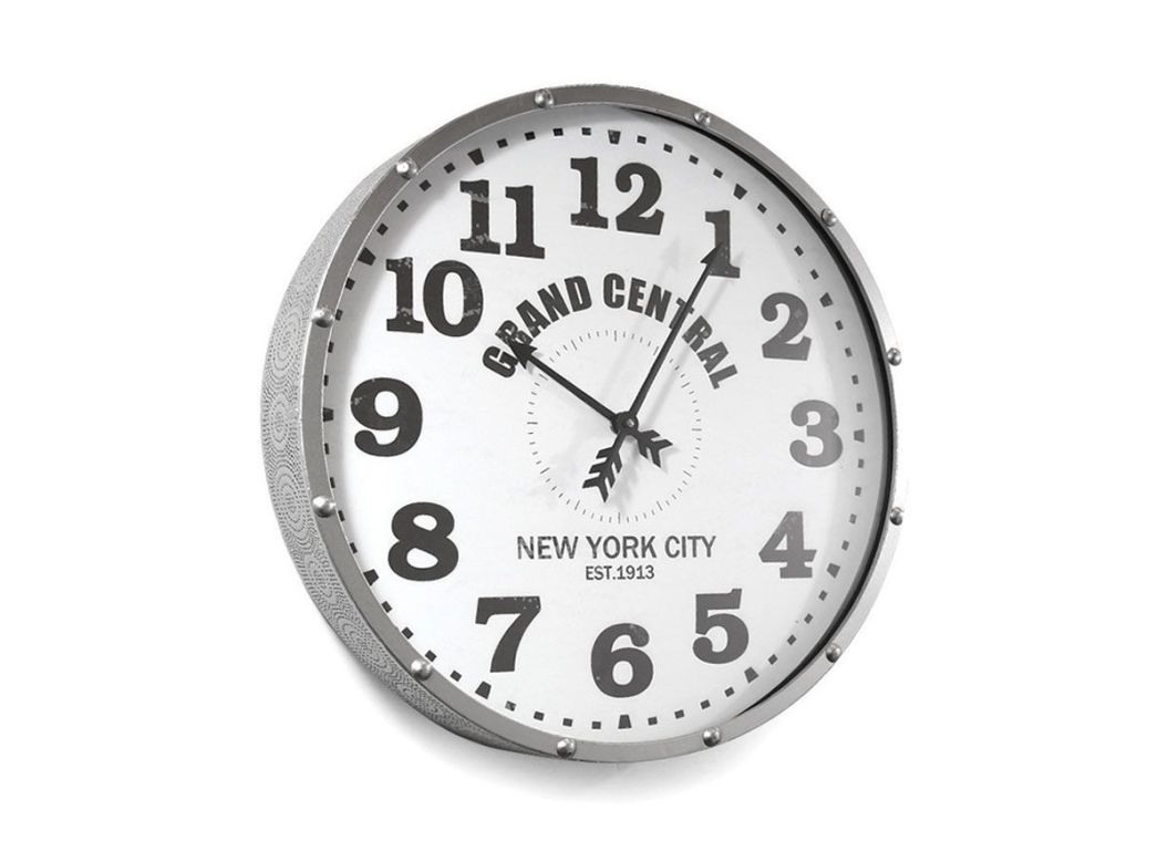 Enjoy the city life and fast times with this 20" wall clock in statement-making style. This clock is crafted from metal and showcases a glass face. Typographic details take their inspiration from Grand Central Station, while this timepiece's distressed numbers bring subtle vintaged style to the design. Black and white hues outfit the face's background for a complementing color palette. With its molded details and factory-inspired flair, this wall clock is sure to up the ante of any space.