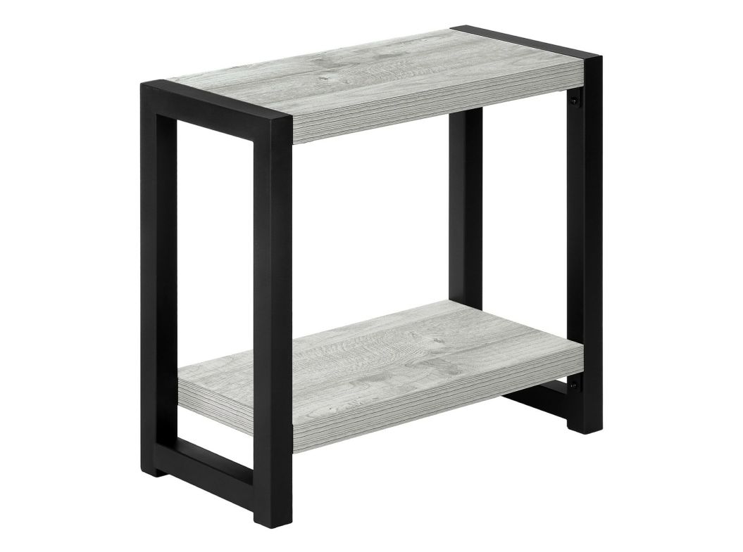 Here's an accent table that holds its own. With its thick tabletop, bottom shelf, and black metal legs, this robust side table stands strong next to a sofa, chair, or bed. Finished on all sides, it can be positioned in any direction to fit both narrow and wide spaces. The two tiers in agrey finish have ample surfaces to display items in your living room or bedroom. Boasting a clean, contemporary style, this rectangular end table coordinates with any décor.