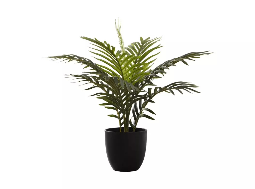 - Add a vibrant burst of greenery to any space with this 20" tall artificial indoor palm plant in a black pot