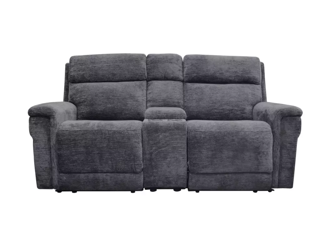 Transform your living space with the Lucie Charcoal Reclining Loveseat, designed for ultimate comfort and style. This chic set features a plush cozy fabric and reclining end seats for ultimate lounging or entertaining. The center console comes with built-in storage and two cup holders, making it easy to keep snacks and drinks within reach.