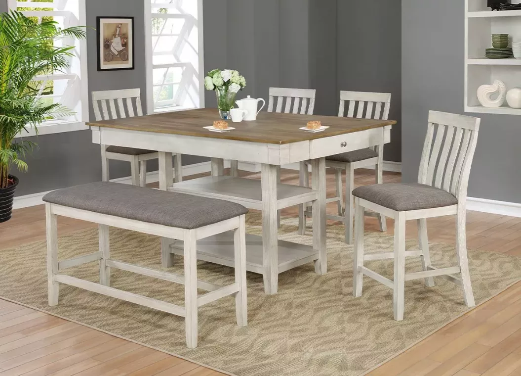 Nina White 6-Piece Dinette Set. Includes Counter Height Table, 4 chairs and bench.
