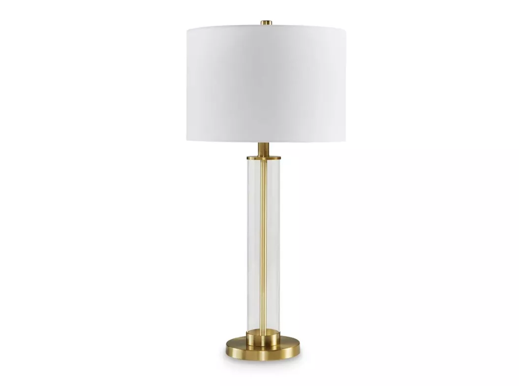 The body of this elegant table lamp has a contemporary flair, with a transparent glass cylinder that reveals a brass-tone rod inside. It's a minimal design made for maximal illumination.