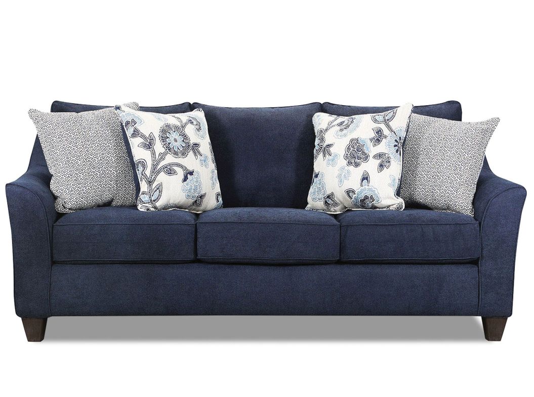 The Prelude Navy Sofa from Lane Home Furnishings offers the ultimate in comfort and design. Featuring loose accent throw pillows, curved track arms, and upholstered deliciously in a soft chenille fabric.