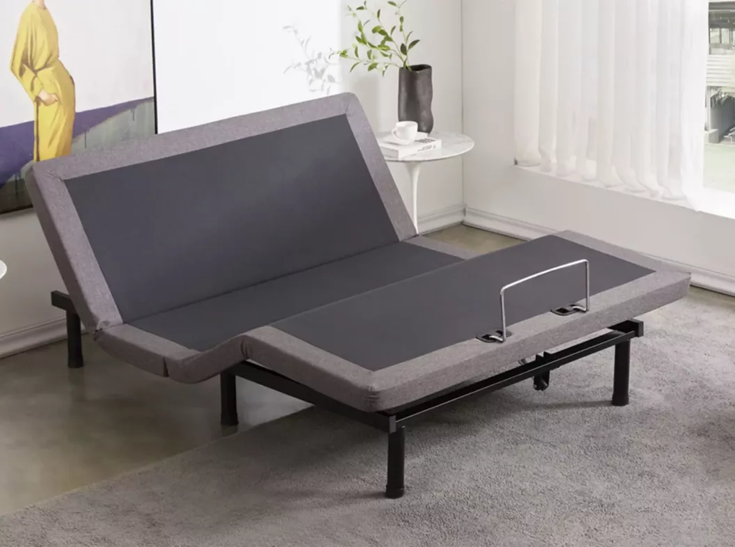 Full power adjustable bed includes wireless remote with flashlight, adjustable legs and is built with a plywood deck, polyester wadding, and anti-skid fabric. Full metal, reinforced frame. Separate modes smoothly and quietly raise head and feet positions. 2 USB ports included on side of platform.