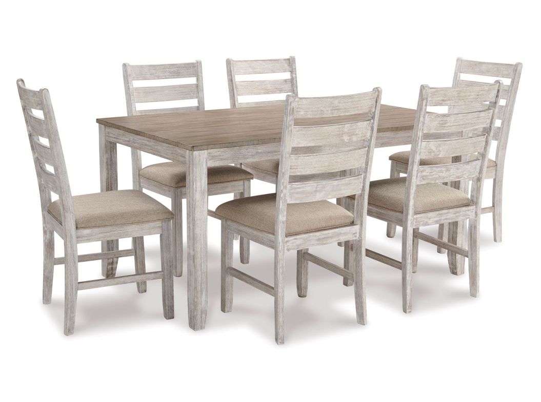 Set the scene for coastal chic or modern farmhouse living with this dining room table set. Clean-lined, simply striking table doubles the charm with a brown tone top with plank effect, paired with a greyish white base with rub through effect for timeworn appeal. Six chairs with classic ladder-back styling and comfortably upholstered seats make room for one and all.