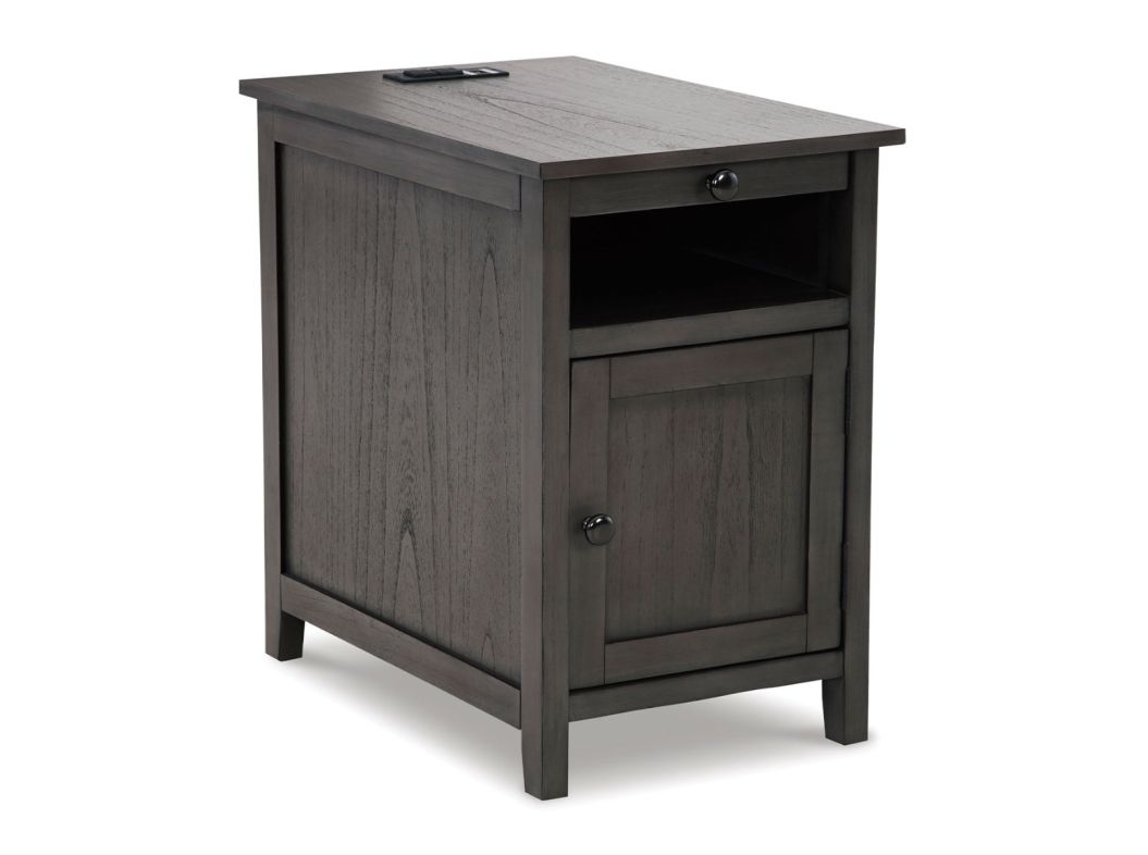 Add big character to a small space with this chairside end table. With its compact size and strong silhouette, it can go anywhere and blend easily into the decor. Less is so much more with the Shaker-inspired design and gray wood tone finish. Loaded with form and function, this end table displays accent pieces and stores essentials securely while keeping devices powered up.