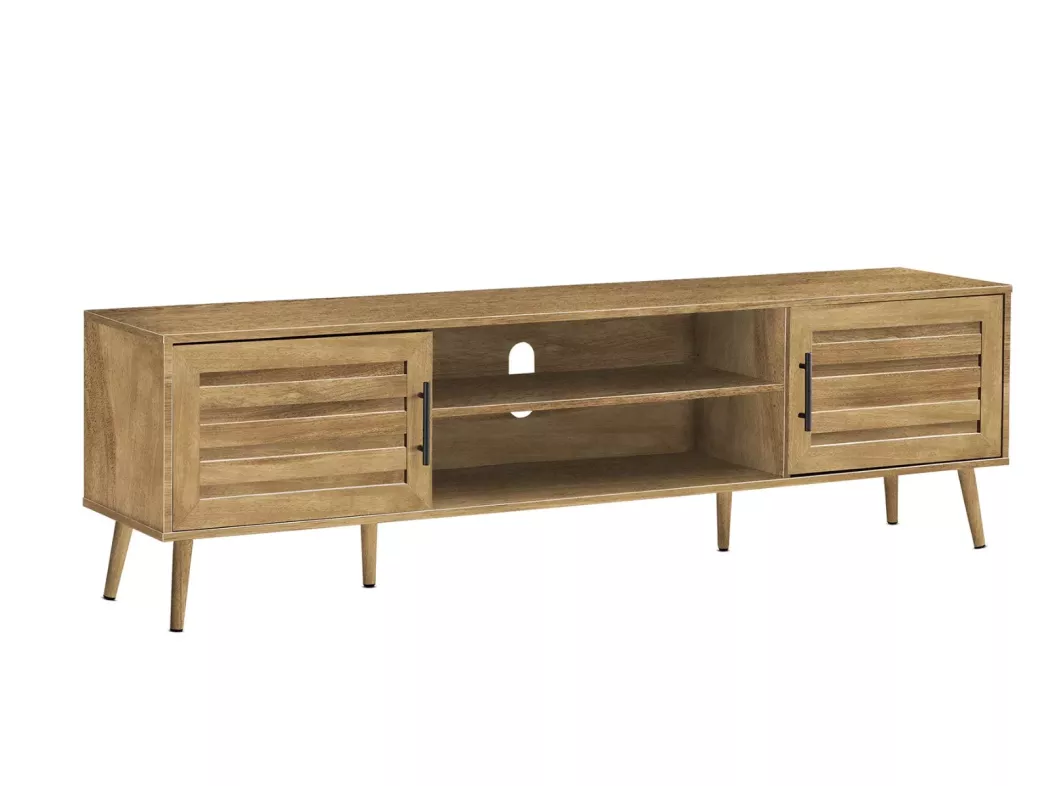 Upgrade your home entertainment with this stylish and functional 72 inch tv stand console in a warm, wood-look walnut laminate finish. It is durably designed with two closed cabinets with sleek black metal handles and a fixed open shelf with a wire management hole, providing ample open and closed storage space for all your media and entertainment needs. The slanted black solid wood legs provides stability for this transitional style tv console that will beautifully blend in with your existing decor. Easy to assemble, this media entertainment center includes all hardware and illustrated assembly instructions, and also comes with a 5 year limited warranty against manufacturer's defects. Add this fashionable tv stand to your living room or bedroom and create a look you'll love for years to come.