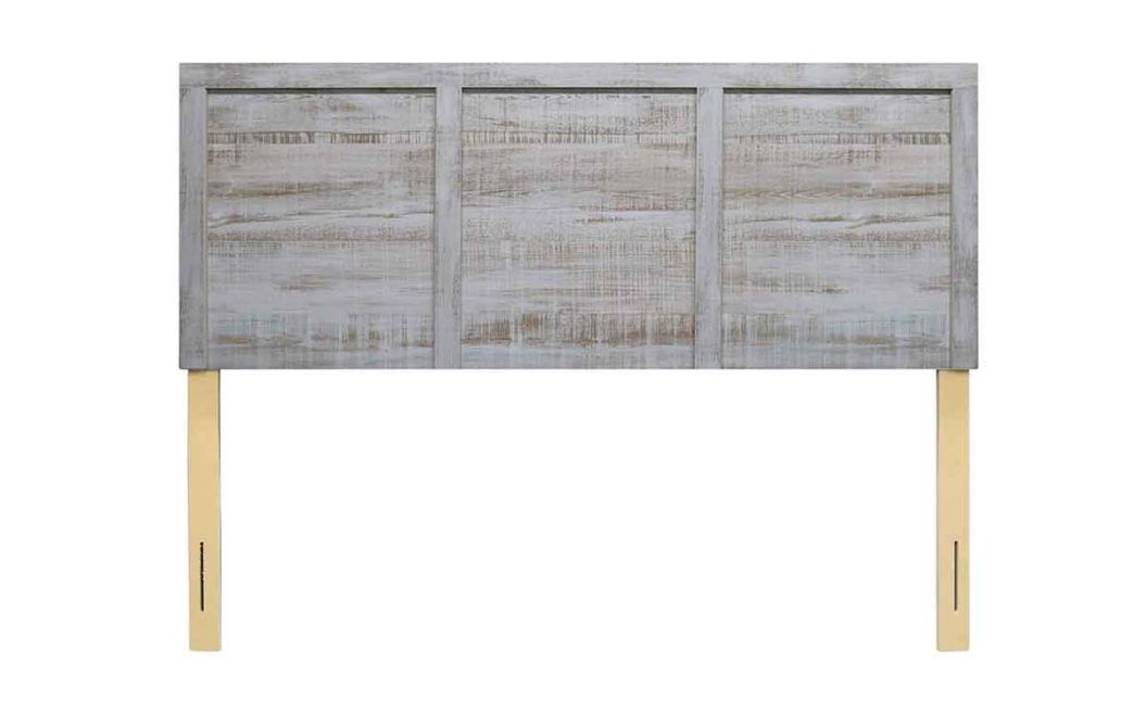 The Weathered Pine Headboard from Dynamic Furniture has rustic character paired with industrial features in an antiqued whitewashed finish that lends a feeling of strength and simplicity.