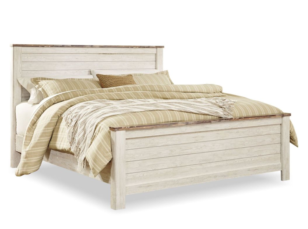 The Willowton 6-Piece King Bedroom Set from Ashley Furniture has a white wash replicated torn style over a replicated pine grain block pattern that will fit a variety of décor. With a prominent white wash wood grain finish, and unique plank-style tops, this bedroom set showcases side roller glides, ring pull hardware and a slim USB charger located on the back of the nightstand. This 6-Piece King bedroom set includes a headboard, footboard, rails, dresser, mirror and nightstand. Matching chest also available.
