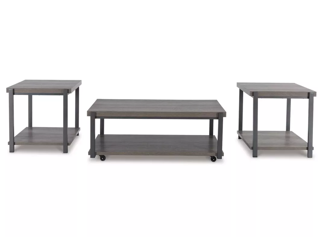 A cohesive, casual contemporary ensemble. This table set is equal parts sleek form and routine practicality. If you\'re hosting guests or need space to stretch out in a recliner, rolling casters on the coffee table clear up extra floor space in a snap. Each table is outfitted with a lower shelf for chic storage and displaying decor.